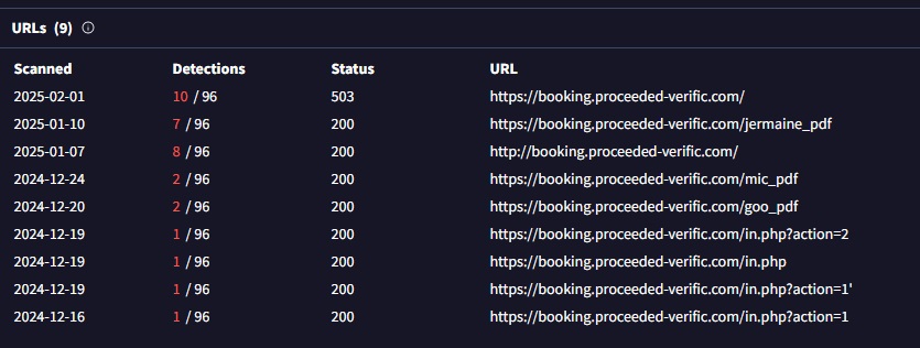 There are multiple subdomains sourced from VirusTotal that can be correlated to our original fake booking link. These related links show that there are multiple subdomains that replicate the same behavior and contain the same ClickFix technique.