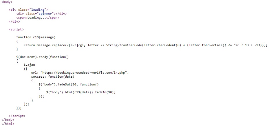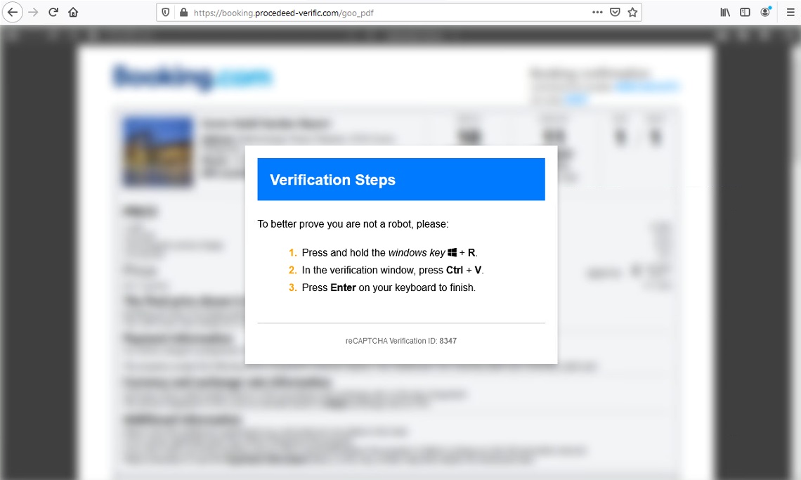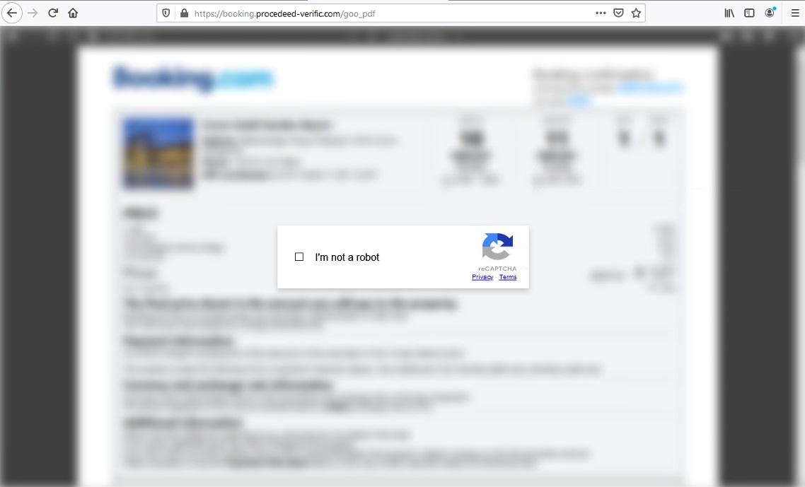 The infection chain starts when a target victim visits a website such as this URL: hxxps://payment-confirmation.82736[.]store/pgg46, the initial attack vector was not successfully extracted during the analysis period therefore we speculated that the source was probably a phishing email. This link redirects to hxxps://booking[.]procedeed-verific[.]com/goo_pdf that contains a blurred document from booking.com. Looking at the link, it might not appear suspicious to an average user, especially with the 'https' in the URL, which could lead the victim to believe the site is safe to visit. Now what is interesting in this webpage is before being able to view the booking document, there is a captcha that requires the user to click the “I’m not a robot” checkbox. Normally this would only prompt some image verification techniques (e.g. “Select all the images with bicycles in them”) to prove that the website is being used by a human user and not by some automated mechanism.