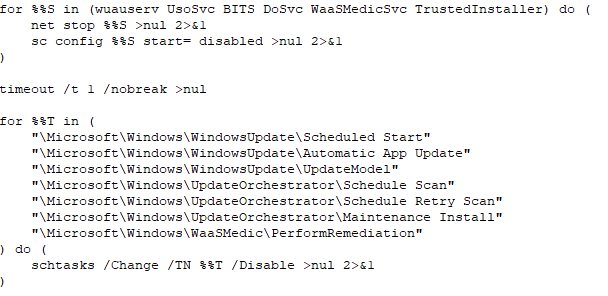 S2.bat disables the Windows Update Service by using 'net stop' and 'sc config' commands to stop related processes and services: