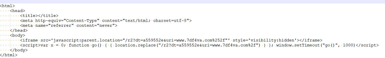 To check the relationship between OneStart and the ManualFinder case, we curiously replaced the domain in the malicious JavaScript from the ManualFinder infection with the domain name from the OneStart sample. If there was no connection, any network path requested would naturally fail. On execution, the script tries to contact https[://]7df4va[.]com/r1?ei=1fLlck&dt=a559552e&uri=www.7df4va.com%2f. This request does not fail and the server responds with the output seen in Figure 5.