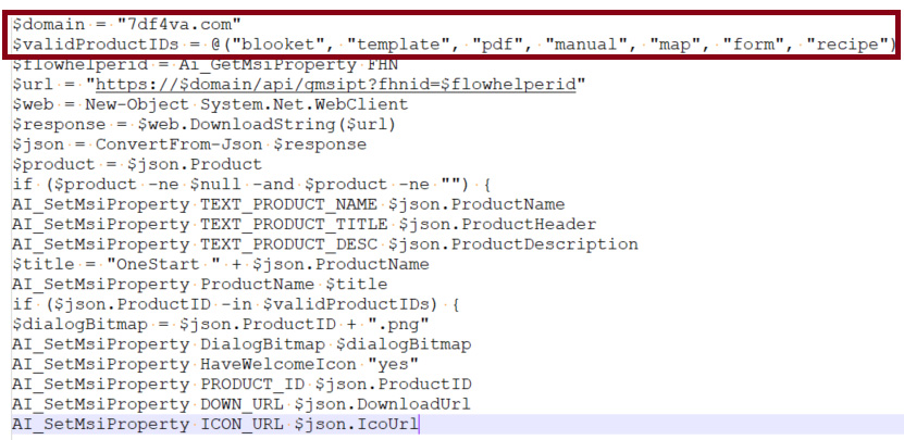 Since a direct connection has been elusive so far, we started to fish for older installers [3] of OneStart which might involve the installation of node.exe. Our search yielded an older version of the software (OneStartInstaller-v4.5.224.8.msi). We observed that in this case, after installation of OneStart, a few PowerShell scripts were run. When examining one such PowerShell script[4] a few curious strings could be noticed. The random domain name and the valid product id string.
