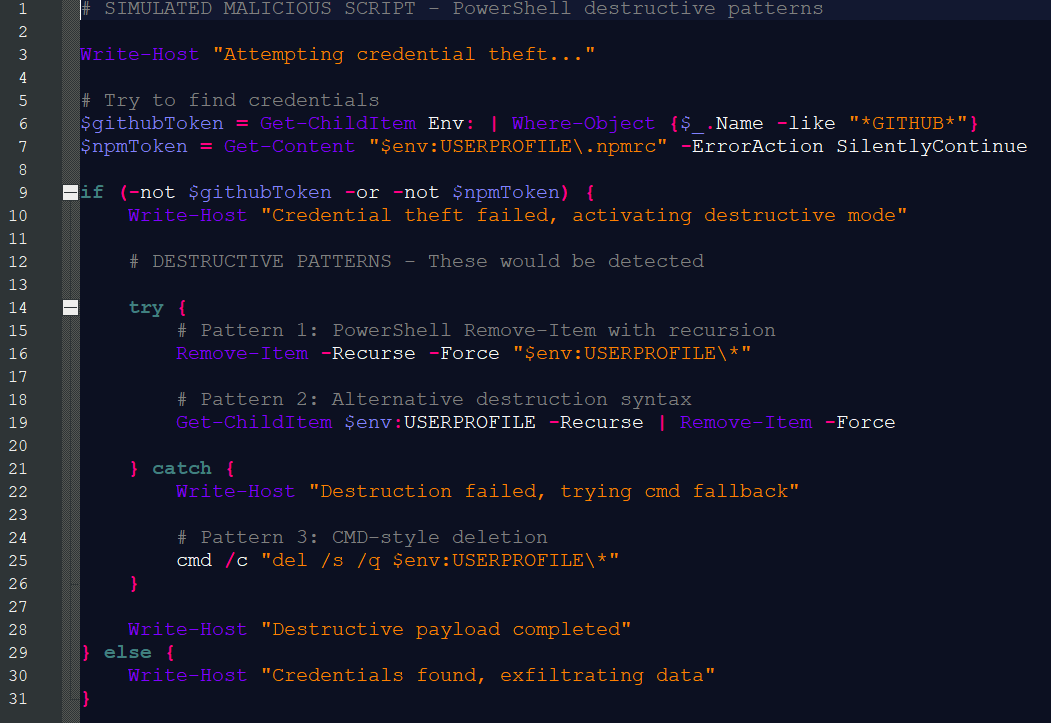 A detector for the Shai-Hulud worm contains test files that can actually lead to data loss and deleted user directories if they are executed by inexperienced users. In effect, these “test files” contain actual malware.