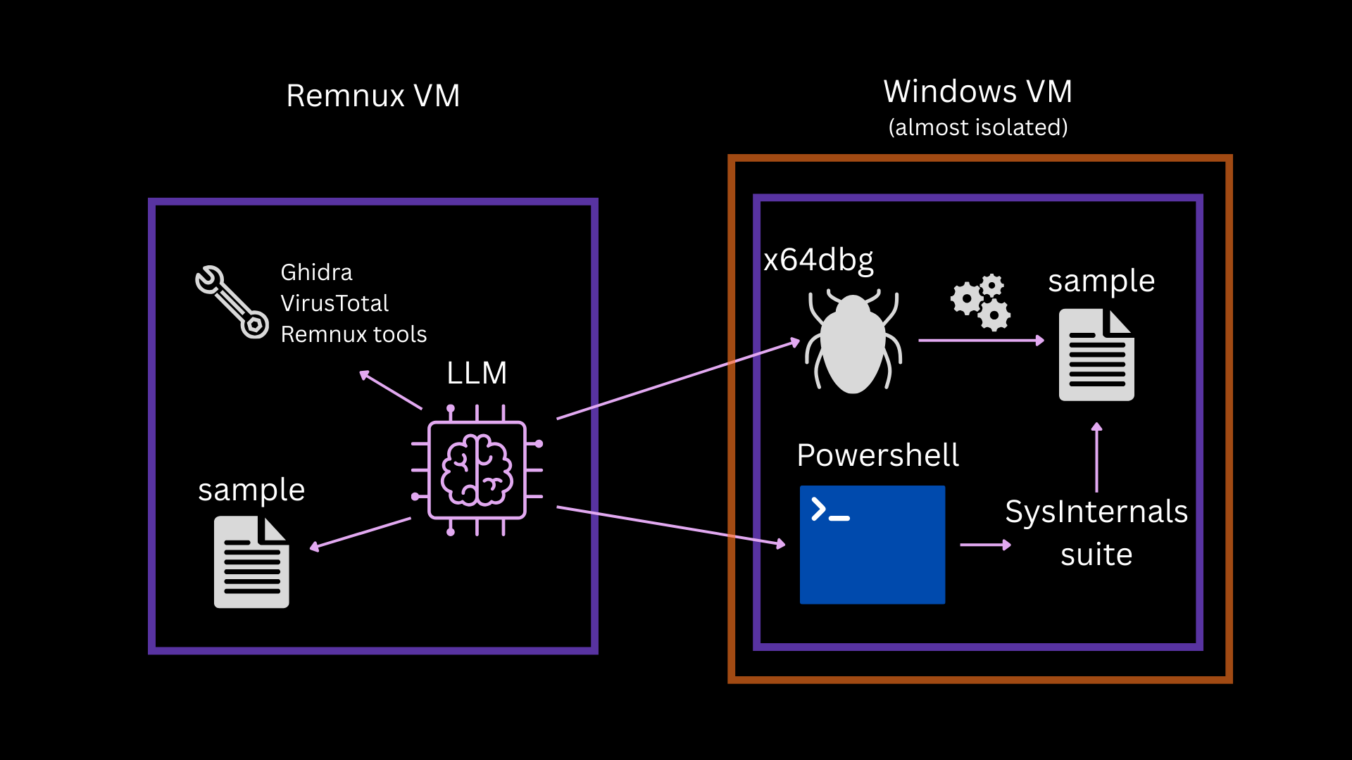 The ssh and x64dbg MCP are connected to the Windows 10 VM. That VM is isolated apart from an internal network adapter and meant to run malicious code, whereas Remnux should be used by the AI for static analysis. The Remnux VM needs an internet connection so that the AI clients work.