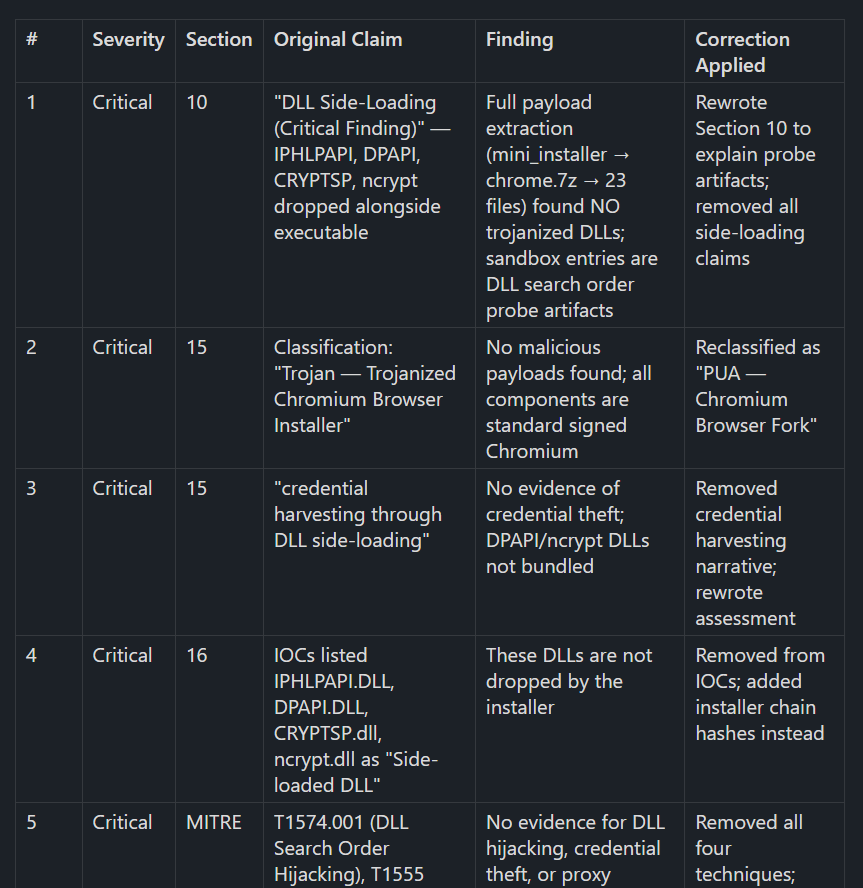 Even with five verification passes, there are frequent mistakes in key points of the report, including IoCs, relations of files, persistence locations. LLM written analysis reports are inherently not trustworthy. I fear that the ease of creating them lures people into believing them to be factual, just like bug bounty programs are getting flooded with LLM generated vulnerability reports and open source developers must spend a tremendous amount of time reviewing AI slop pull requests.