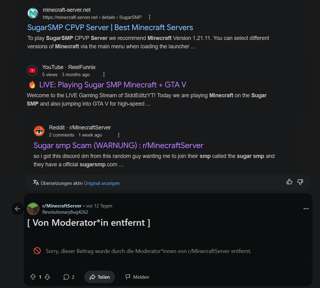 Only one search result is a cached scam warning of a Reddit user, whose accounts were hacked after installing the SugarSMP mods. After clicking on that search result, we only see a message that the post has been deleted by Reddit moderators.