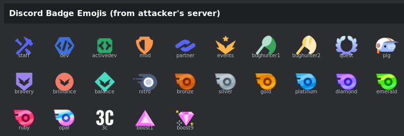Both, the Discord injection code and the main stealer code, reference 25 custom emojis (see figure 7). They are part of the exfiltration message template that the stealer sends to the threat actor’s Discord server.