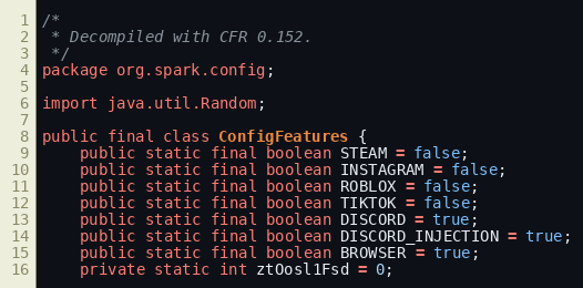 The main configuration of the sample is in ConfigFeatures.class, which in this case has most features disabled except for stealing browser data, Discord tokens and performing Discord injection.