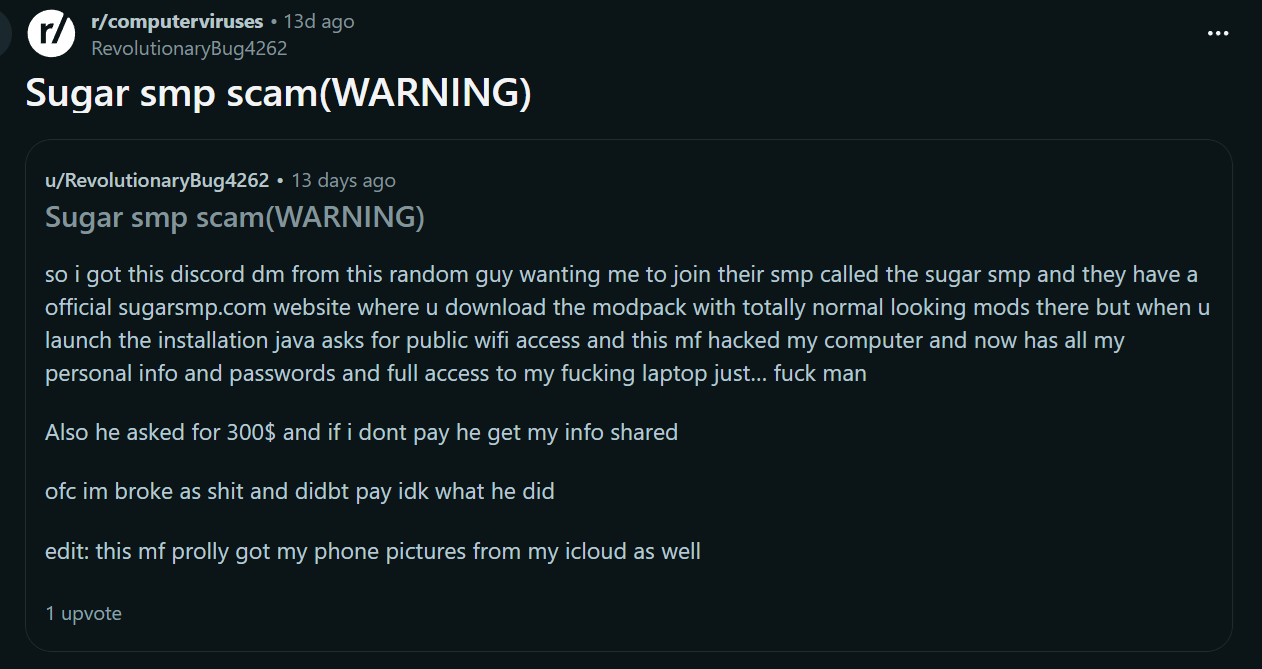 On 7th March the SugarSMP owner requested Reddit moderators of r/computerviruses to take down a post about infected files on their site. The scam warning post is from 27th February. In it, the user describes that not only their accounts and data were stolen after installing SugarSMP mods, but also that the SugarSMP owner extorted them for 300$ by threatening to publish private information.