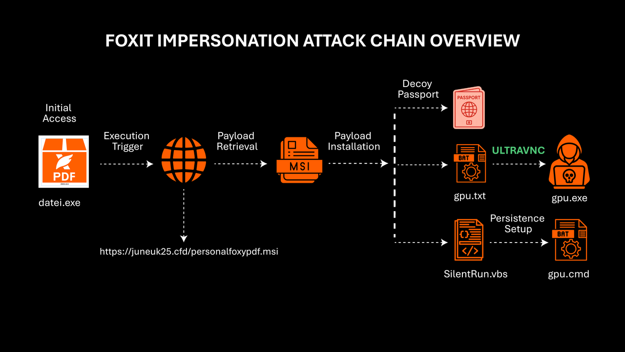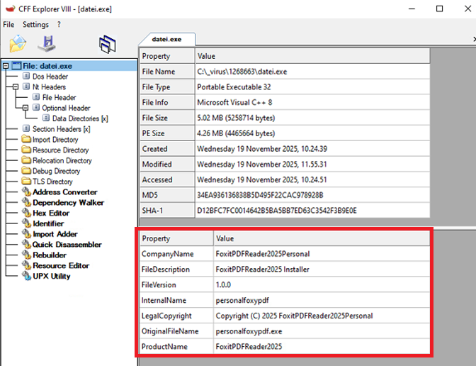 Several filenames have been observed in the wild that are associated with this case, including Datei.exe, 1.exe, and Document09.10.2025.exe. None of these follow the official naming convention used by Foxit Software installers but rather designed to look like documents. For users expecting to open a document, that inconsistency is easy to miss, which is exactly what the attacker relies on.