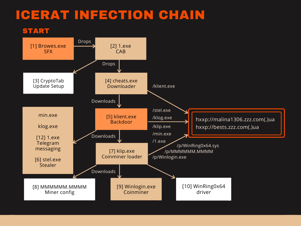 The Windows Cabinet file is also a dropper for two more files, namely a non-malicious setup[3] for CryptoTab software, and a malware downloader named cheats.exe[4]. CryptoTab is a browser with mining features, but its installation is not silent. The affected user will see the browser setup window (see image below) which is why I assume CryptoTab is provided as a lure. To summarize: The infection chain starts with a downloader in a trojanized dropper in a dropper.