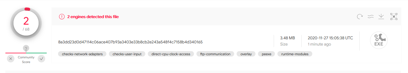 User McMcbrad of the Malwaretips.com forums discovered the first IceRat samples[5][7]. The malware caught his interest due to the low detection rates on VirusTotal for most related samples. At the time of discovery only 2 to 3 engines showed a detection despite the samples being a month old.