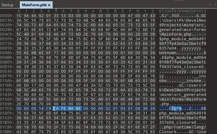 As I noticed after looking at several JPHP samples, the entrypoint for the main JPHP code is under .system\application.conf (see picture below). So for our klient.exe sample[5] the main code resides in app\forms\rqfdeqwf.phb.