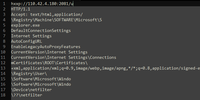 At hxxp://110.42.4.180:2081/p the malware requests the proxy which it sets as AutoConfigURL in the registry key \Software\Microsoft\Windows\CurrentVersion\Internet Settings. The returned value at the time of writing is hxxp://ptaohuawu.bagua.com.hgdjkgh.com:2508/baidu.txt