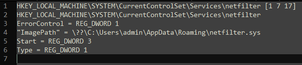 The dropper places the driver into %APPDATA%\netfilter.sys. Then it creates the file %TEMP%\c.xalm with the following contents and issues the command regini.exe x.calm to register the driver.