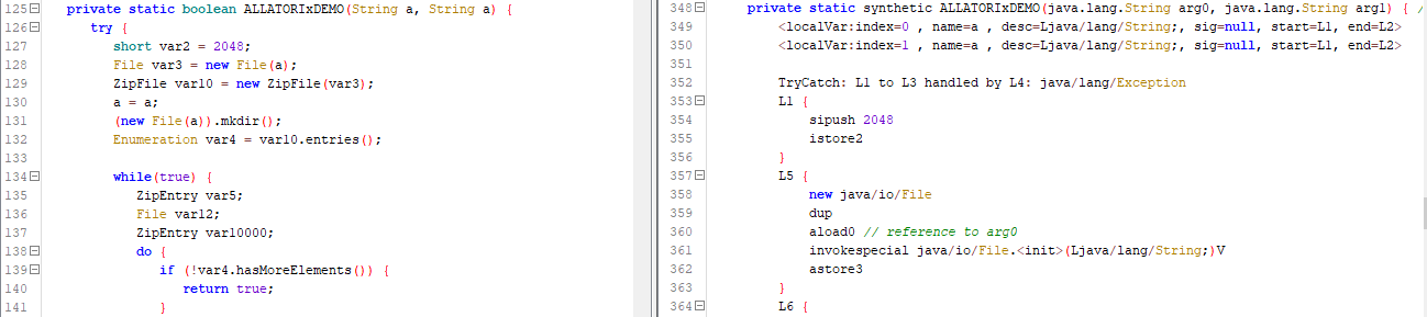 An example is seen in the image below. The left side shows decompiled Java code with both arguments named 'a'. The right side shows the same method in Java bytecode. The first argument 'arg0' is later referenced by it's index via 'adload0'.
