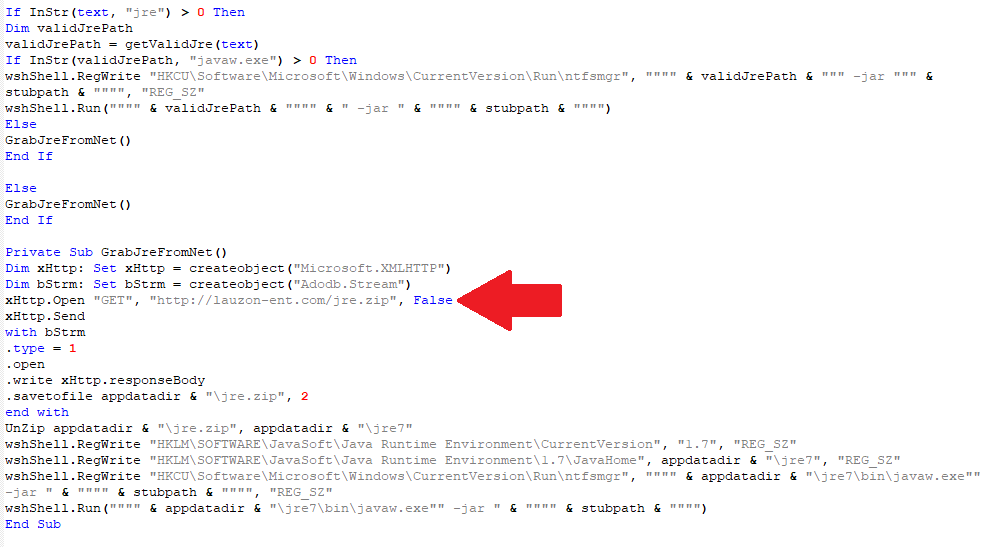 The VBScript continues to write the actual payload to %APPDATA%\ntfsmgr.jar[4] and add a RUN key named ntfsmgr to the registry that will autorun the dropped Jar[4] . The RUN key will use the newly installed JRE if no JRE was present before.
