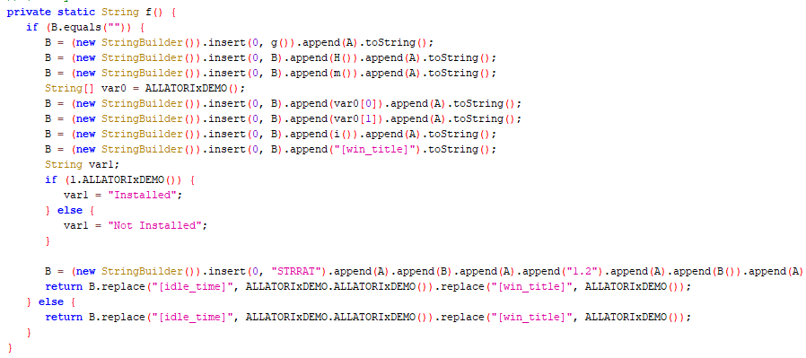 Method f in class strpayload.r builds a string with information about the infected system. Among others it shows name and supposedly version number of the malware, which is "STRRAT 1.2".