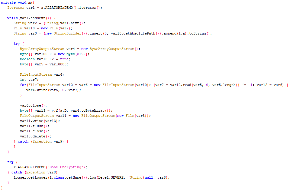 Ransomware "encrytion" and "decryption" methods are in the class strpayload.l. The "encryption" method is seen in the screenshot below.