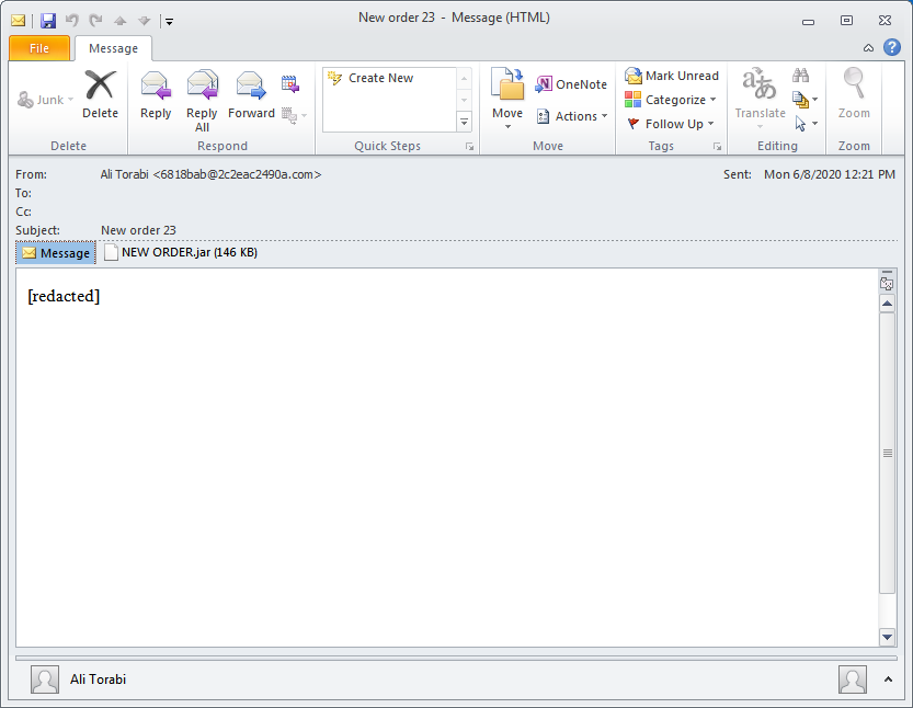 I found this email via VirusTotal graphs which shows a relationship to our Jar file. It is not clear if the uploader of the email redacted the email body or if the threat actors didn't want to take their time to add any content. It should be noted that Outlook prevents access to email attachments with .jar extension. In this case I applied a registry hack to have it shown anways.